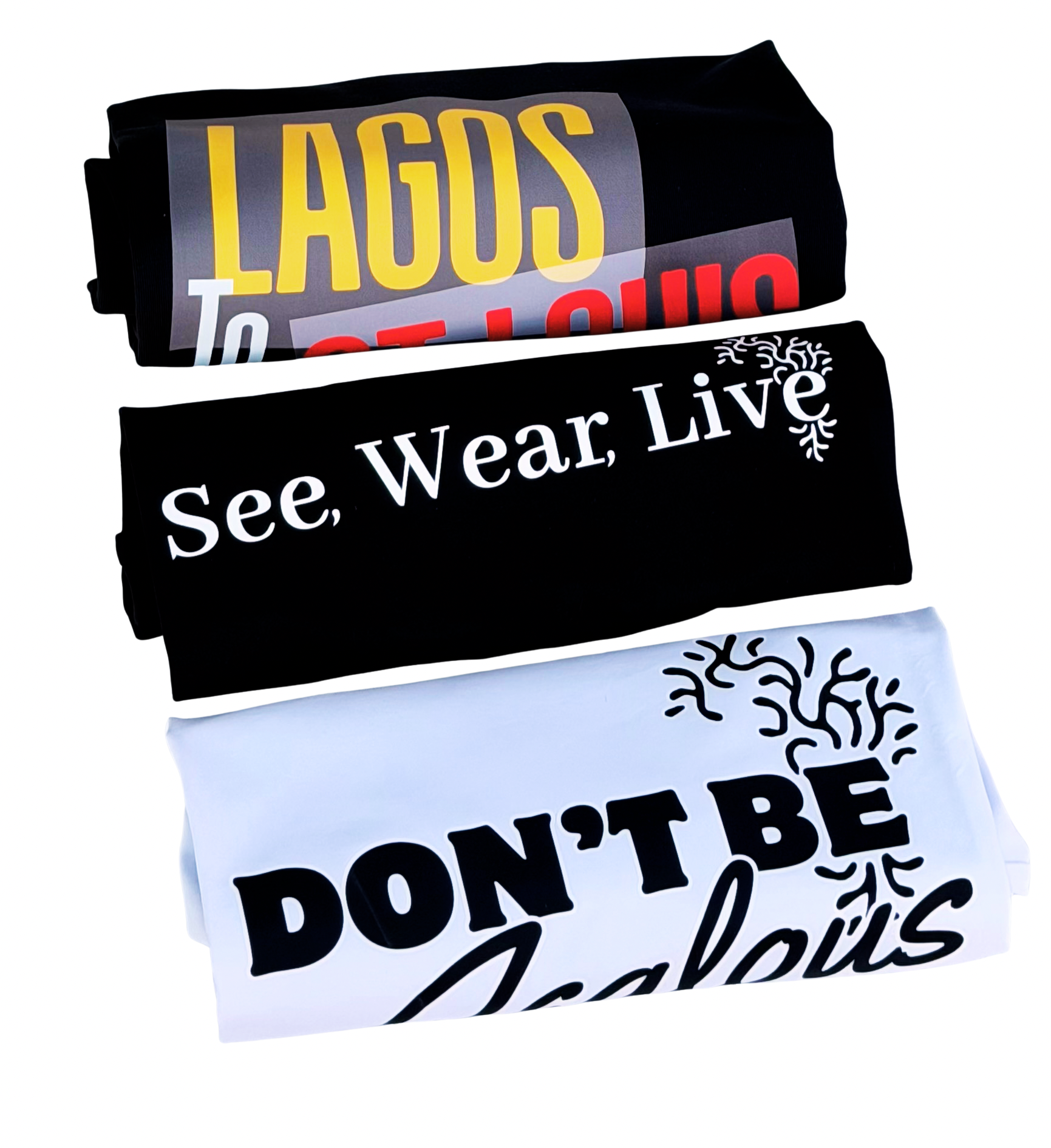 We’ve also included two regular-fit tees, perfect for any occasion. One is a playful reminder to anyone looking your way: don’t be jealous — beauty like yours deserves to be admired. The other proudly declares: live and wear Africa with pride — because why not?